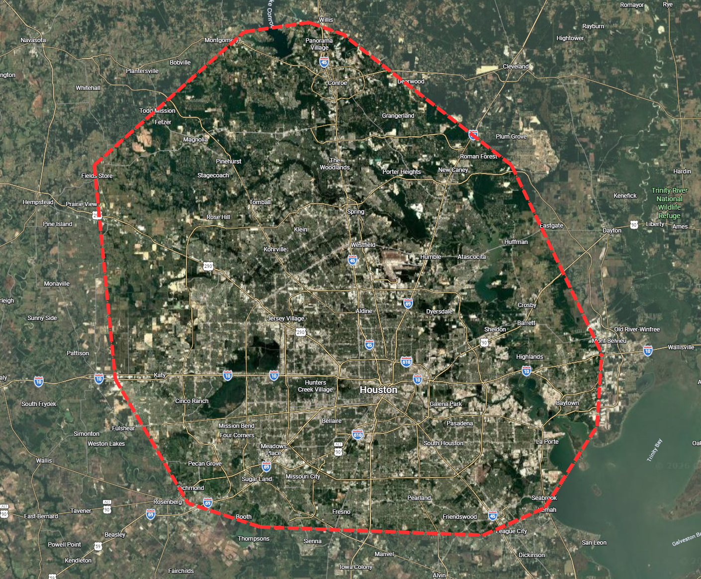 We are located in Spring, Texas and travel about 1-1.5 hours in each direction. Any job site 25+ miles from our shop may be subject to a travel charge depending on distance.